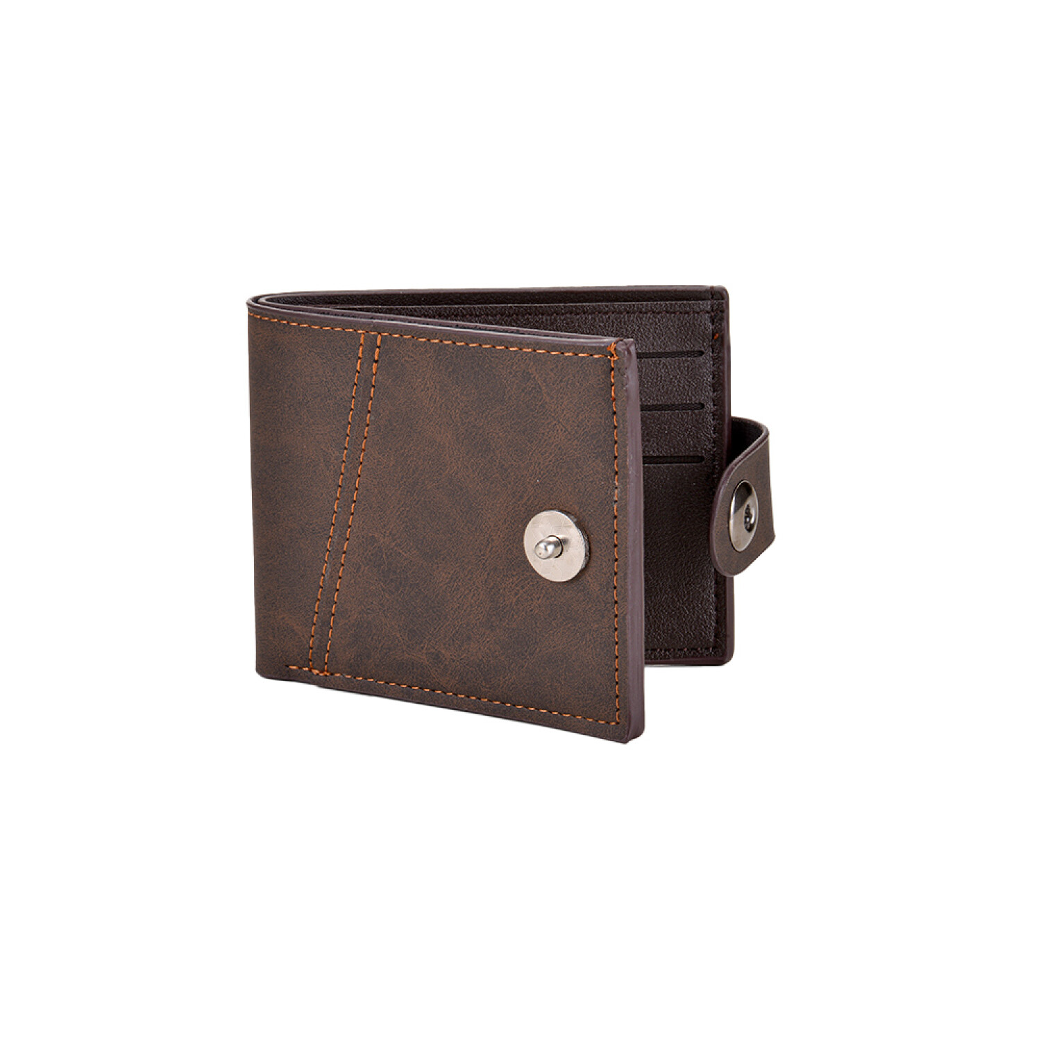 Fabricada en material símil cuero marrón, cuenta con 5 divisiones para tarjetas, un visor transparente para fotos o documento y un bolsillo interior con cierre.